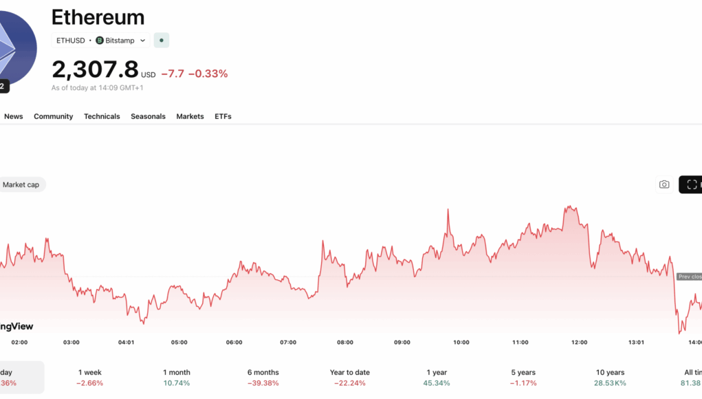 ETH did clear one early hurdle: it broke above a bearish trend line at $2,300 and pushed through the 23.6% Fibonacci retracement of the $2,465-to-$2,253 drop. That’s a real, if modest, positive. The problem is what happened next: the price spiked to $2,335, ran into sellers, and has been grinding below $2,350 ever since.