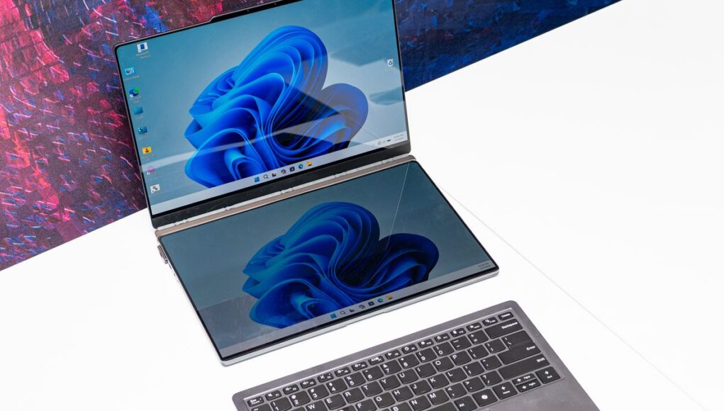 If you don’t have the desk space for that orientation, you can always remove the keyboard from the base and pop the second screen there—it’ll auto-connect to the laptop via the pogo pins, and you’ll be able to use the Bluetooth keyboard to type on a dual-screen setup that resembles the Asus ZenBook Duo. The whole system is a fantastically portable method of improving productivity on the go, and the laptop isn’t too thick or cumbersome.